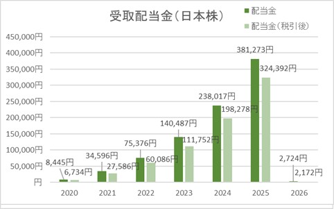 現時点での2026年の受取配当金実績(累計)は2,724円(税引き後2,172円)でした。1月は配当金を出してもらえる銘柄が少ないですが、少額でもいただけるとモチベーションが上がります。